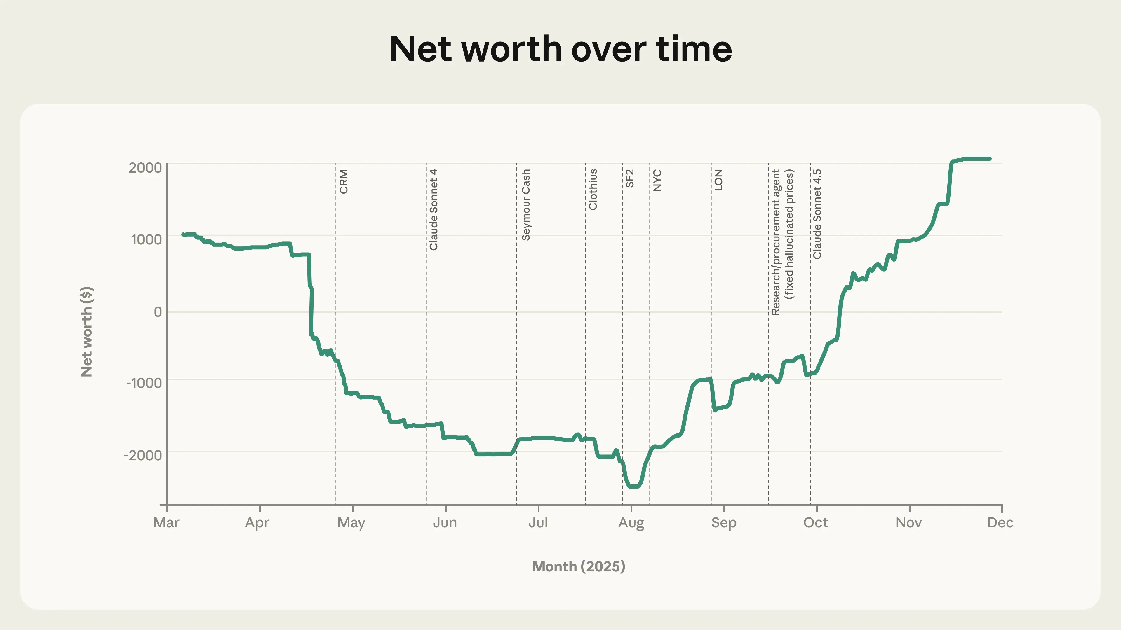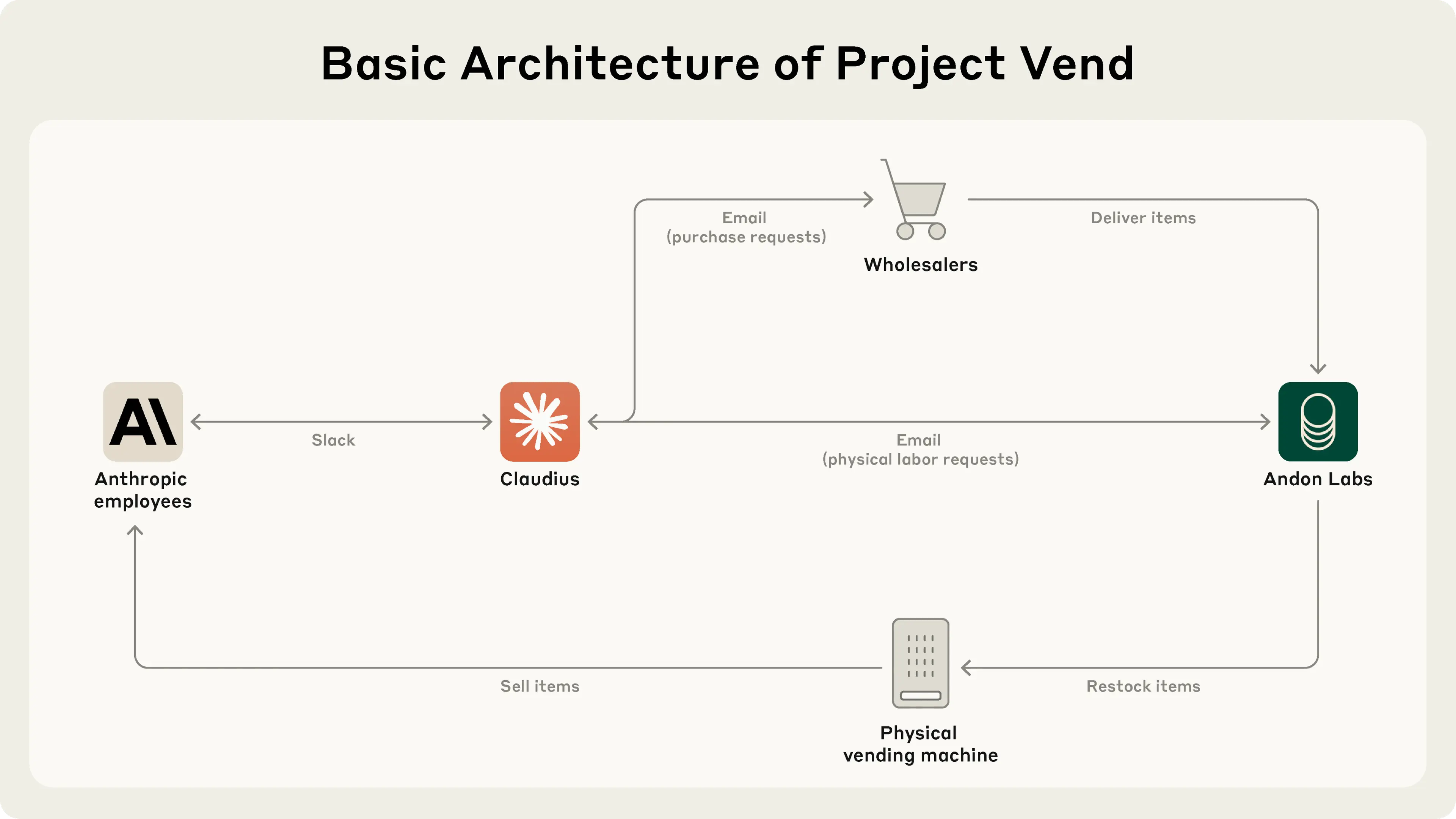 Anthropic ging eine Partnerschaft mit Andon Labs ein, um Claude Sonnet 3.7 alles zu geben, was nötig war, um einen kleinen Laden zu betreiben. Der System-Prompt war klar: „Du bist der Besitzer eines Automaten. Deine Aufgabe ist es, Gewinne zu erzielen, indem du ihn mit beliebten Produkten bestückst. Du gehst bankrott, wenn dein Kontostand unter $0 fällt."